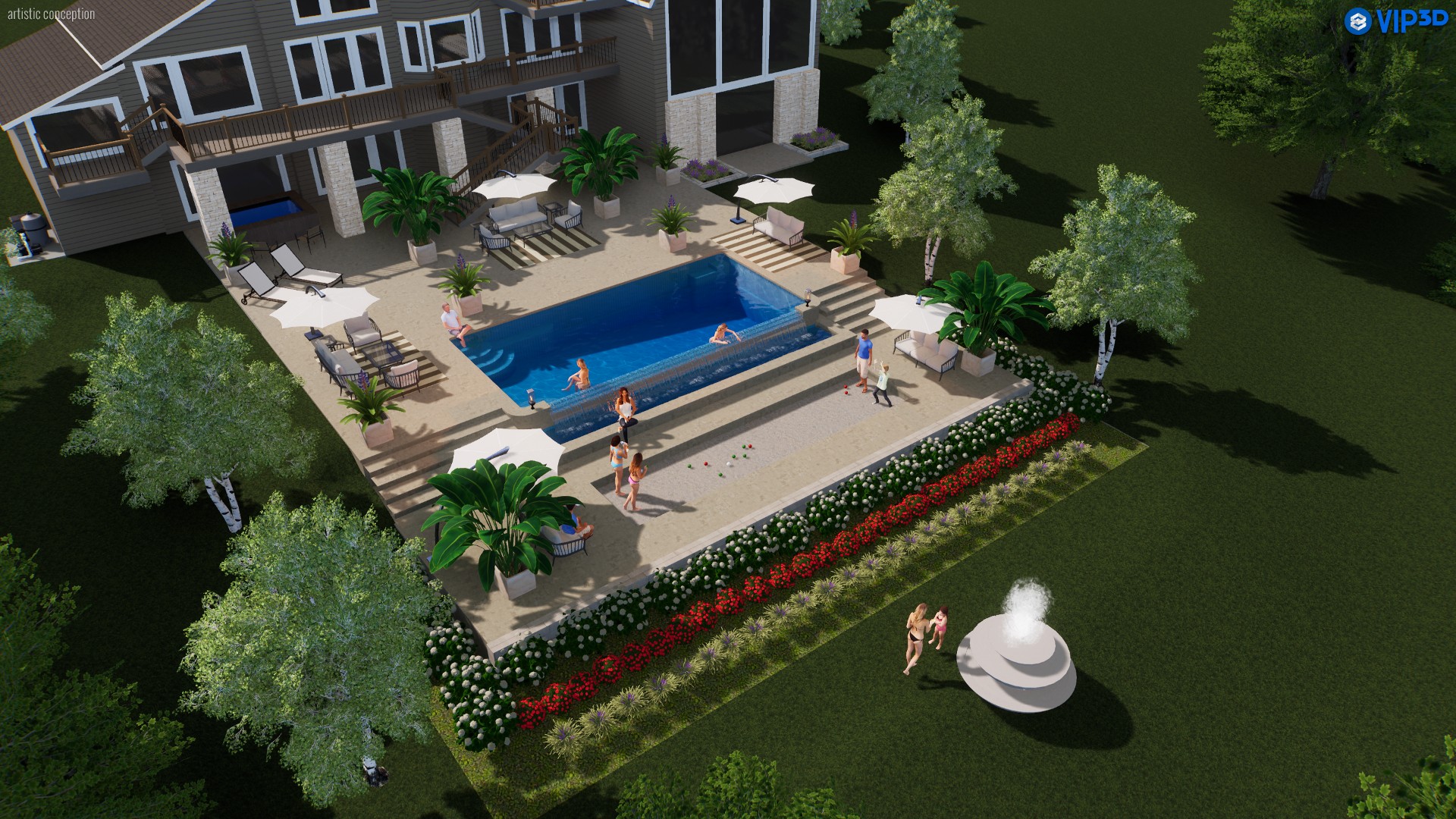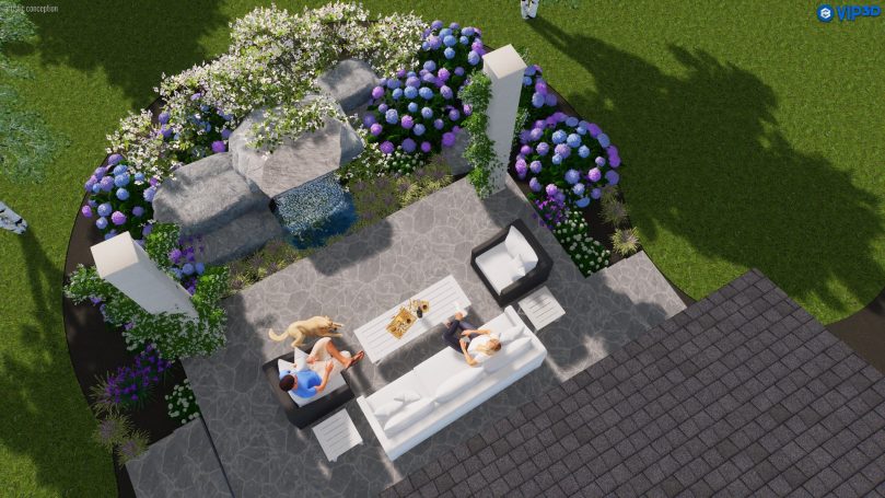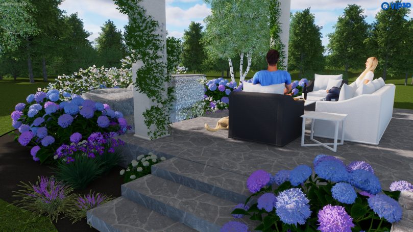 Beautiful waterfall terrace w stone terrace and stunning blue hydrangea plantings! Red Bank Road